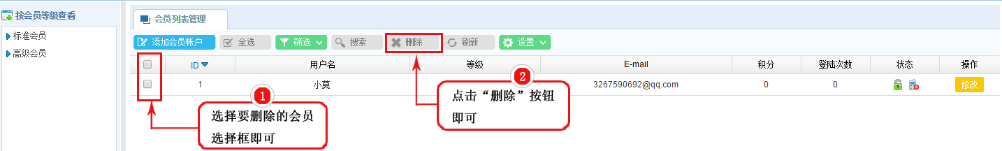 1、在會員列表管理區(qū),選中要刪除會員的選項框;